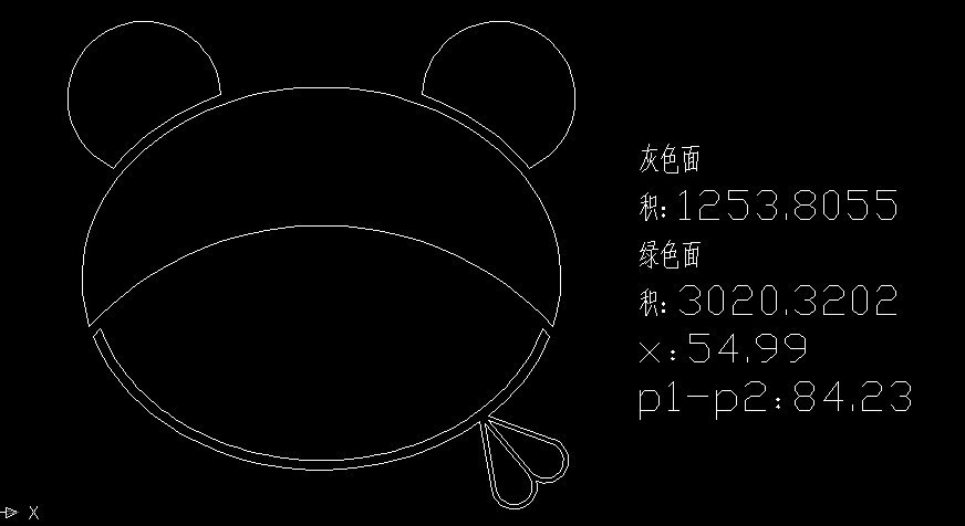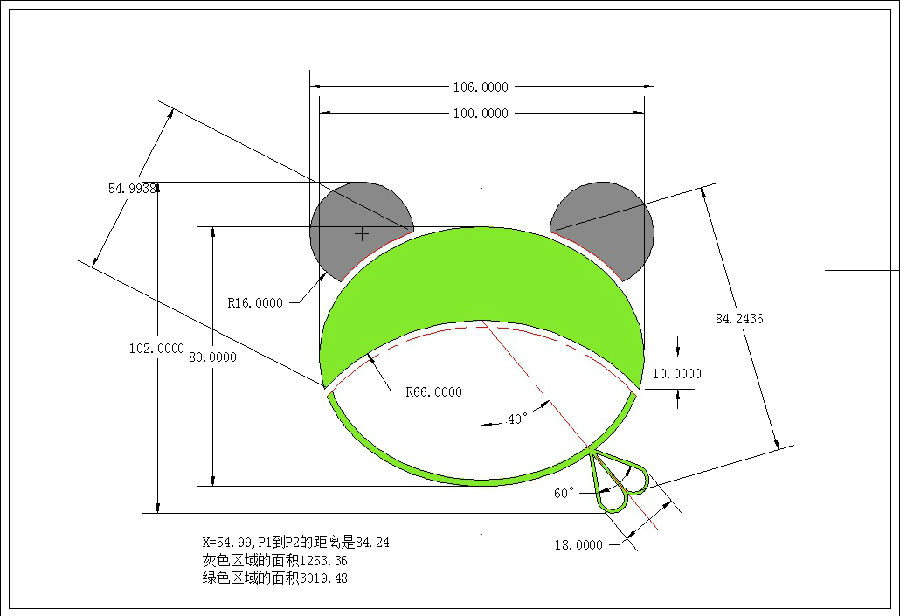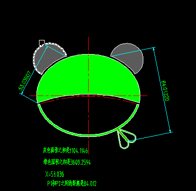 X=54.99,P1到P2的距离是84.24灰色区域的面积1253.36绿色区域的面积3019.48