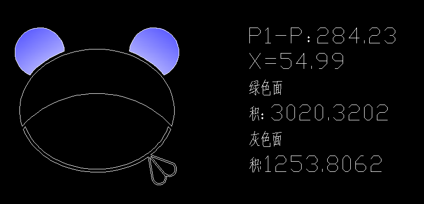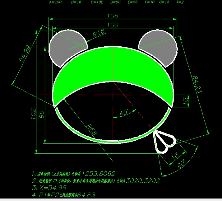 1、灰色面积(上方的两块)之和是 626.9033 。2、绿色面积(下方的两块,注意不包含局部放大视图部分)之和是 231.1013 。3、X= 54.989 。4、P1和P2之间的距离是 84.2827 。